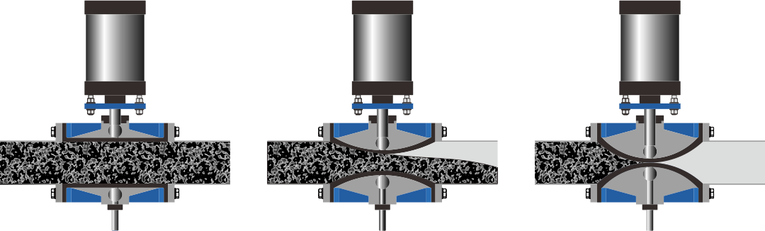 Chiudi: Il meccanismo di azionamento (manuale, pneumatico o elettrico) spinge due aste di bloccaggio, comprimendo con precisione il manicotto resiliente lungo la linea centrale per ottenere una tenuta ermetica. Anche quando nel mezzo sono presenti particelle solide, queste sono strettamente racchiuse e bloccate.